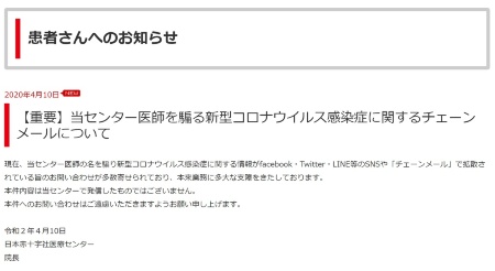 医師名かたる新型コロナチェーンメールに注意 日本赤十字社医療センター 当センターで発信したものではない ねとらぼ
